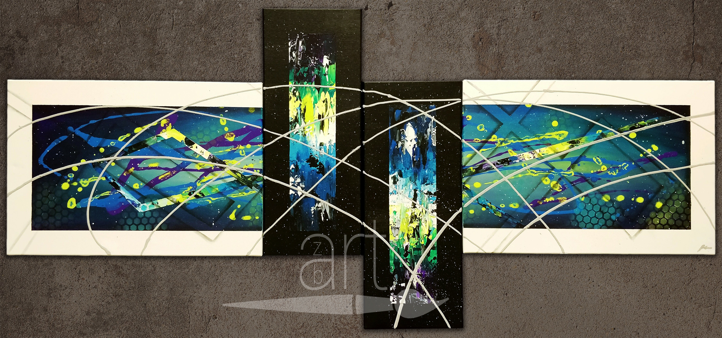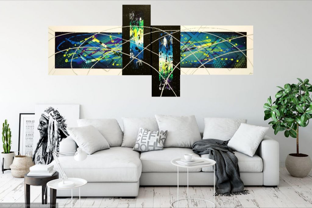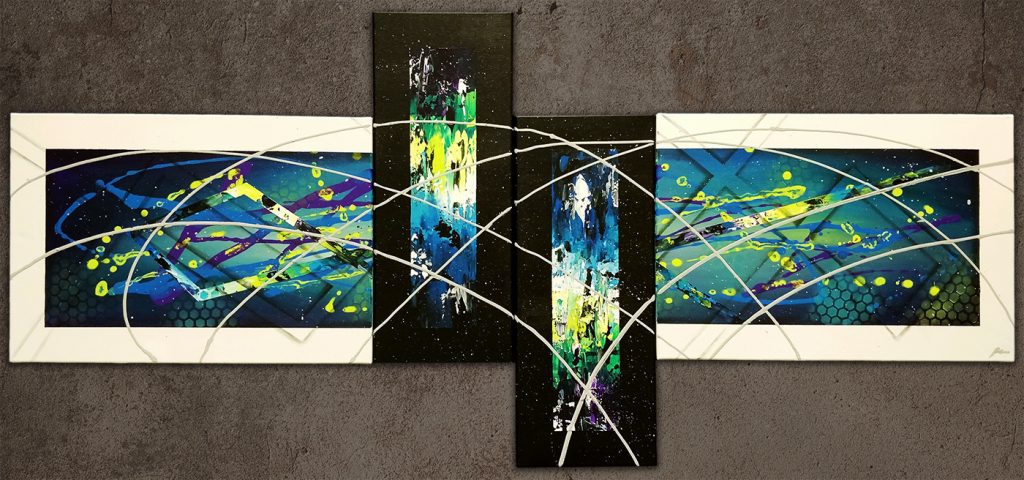 Abstract / Masking Tape Technique Breaking Boundaries BREAKING BOUNDARIES – Abstract Acrylic Painting on canvas – 140 × 50 cm (59 × 20 in)– 4 piece composition– Masking tape technique– Not SOLD – Get the original for 200 € Breaking Boundaries | 2019 | 200€